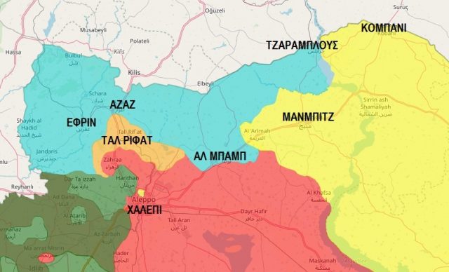 Στρατιωτικός χάρτης της βορειοδυτικής Συρίας. Με γαλάζιο χρώμα απεικονίζονται τα τουρκοκρατούμενα εδάφη. Με κίτρινο χρώμα τα υπό κουρδικό έλεγχο εδάφη, με κόκκινο η κυβέρνηση, με πορτοκαλί οι Ρώσοι, με πράσινο η Αλ Κάιντα και άλλοι ισλαμιστές.