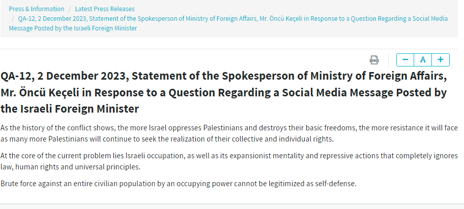 Η δήλωση του Kecheli, όπως επισημαίνεται από το υπουργείο Εξωτερικών, είναι απάντηση σε μήνυμα του Ισραηλινού υπουργού Εξωτερικών Eli Cohen στα κοινωνικά δίκτυα.Ο Cohen έκανε αρκετές αναρτήσεις στο κοινωνικό δίκτυο X το Σάββατο (2/12), σε μία από τις οποίες στοχεισε την τουρκική προεδρία και είπε ότι η Τουρκία θα μπορούσε να «φιλοξενήσει» μέλη της Hamas που θα μπορούσαν να εγκαταλείψουν τη Λωρίδα της Γάζας «αν δεν εξαλειφθούν».«Όπως έχει δείξει η ιστορία της παλαιστινιο-ισραηλινής σύγκρουσης, όσο περισσότερο το Ισραήλ καταπιέζει τους Παλαιστίνιους και τους στερεί θεμελιώδεις ελευθερίες, τόσο ισχυρότερη είναι η αντίσταση που θα αντιμετωπίσει το Ισραήλ, τόσο περισσότερο οι Παλαιστίνιοι θα υπερασπίζονται τα συλλογικά και ατομικά τους δικαιώματα», είπε ο Keceli.Σύμφωνα με τον ίδιο, η ρίζα της σύγκρουσης είναι η ισραηλινή κατοχή των παλαιστινιακών εδαφών, καθώς και «μια επεκτατική νοοτροπία και καταστολή που αγνοεί εντελώς το (διεθνές) δίκαιο και τα ανθρώπινα δικαιώματα θεωρείται ως νόμιμη αυτοάμυνα», επισήμανε ο εκπρόσωπος του τουρκικού υπουργείου Εξωτερικών.