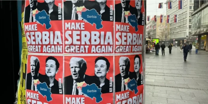 Οι αφίσες απεικονίζουν τον Ντόναλντ Τραμπ και τον Ίλον Μασκ με το σύνθημα, το οποίο αντιγράφει το προεκλογικό μήνυμα του νεοεκλεγμένου προέδρου των ΗΠΑ  «Make America Great Again»: «Make Serbia Great Again»/ Ας κάνουμε τη Σερβία ξανά μεγάλη.