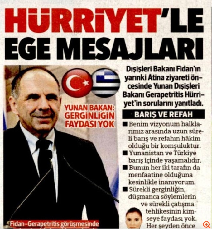 Λίγες ώρες προτού να συναντηθεί με τον υπουργό Εξωτερικών της Τουρκίας, Χακάν Φιντάν, ο Γιώργος Γεραπετρίτης έδωσε συνέντευξη στην τουρκική εφημερίδα Hürriyet, η οποία τιτλοφορείται "Δεν ωφελεί η ένταση", ενώ εντός του άρθρου τονίζεται η φράση "Οι δύο γείτονες πρέπει να ζουν ειρηνικά".