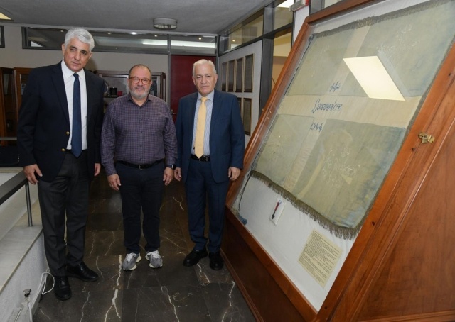 (Ο γενικός γραμματέας της ΚΕΔΕ Δημήτρης Καφαντάρης, ο δήμαρχος Κομοτηνής Γιάννης Γκαράνης και ο πρόεδρος της ΚΕΔΕ Λάζαρος Κυρίζογλου πλάι στην ιστορική σημαία της Κομοτηνής)