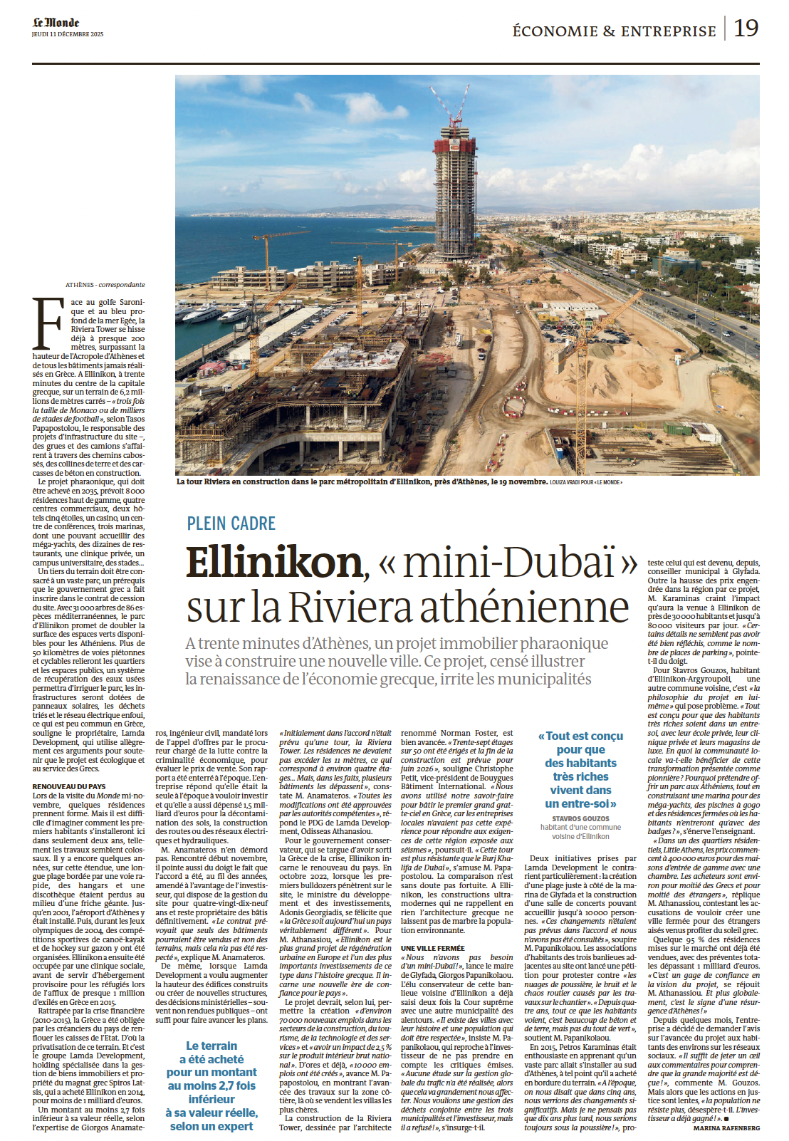 Το έκανε η έγκυρη γαλλική εφημερίδα Le Monde, η οποία αφιέρωσε μία ολόκληρη σελίδα της για όσα συμβαίνουν στο Ελληνικό. Μεταξύ αυτών που μίλησαν στη δημοσιογράφο Marina Rafenberg, είναι και ο πολιτικός μηχανικός Γιώργος Αναματερόςο οποίος μέσω του militaire channel και της Εφημερίδας των Συντακτών, έχει βγάλει στη φόρα όλα τα στραβά και ανάποδα της «εμβληματικής επένδυσης». Δικαιοσύνη αλλά και πολιτικά κόμματα δεν έχουν τολμήσει να ασχοληθούν με όσα επώνυμα έχει καταγγείλει ο Γιώργος Αναματερός.