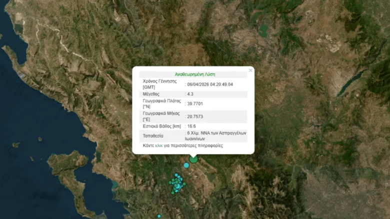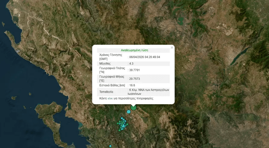 Ιωάννινα.- Σεισμός 4,3 βαθμών της κλίμακας Ρίχτερ σημειώθηκε στις 7:20 το πρωί της Μεγάλης Δευτέρας (06.04.2026) στα Ιωάννινα αναστατώνοντας τους κατοίκους.